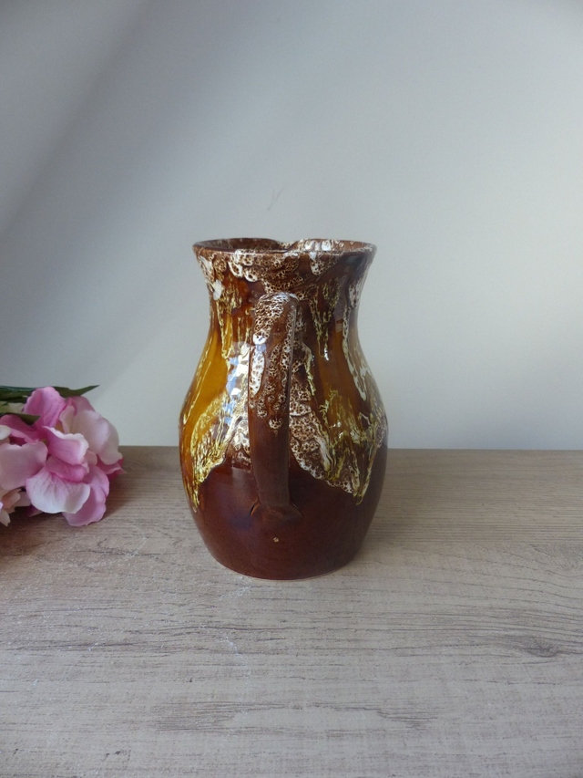 Joli pichet ou carafe en céramique marron aux motifs flammés blanc et jaune.