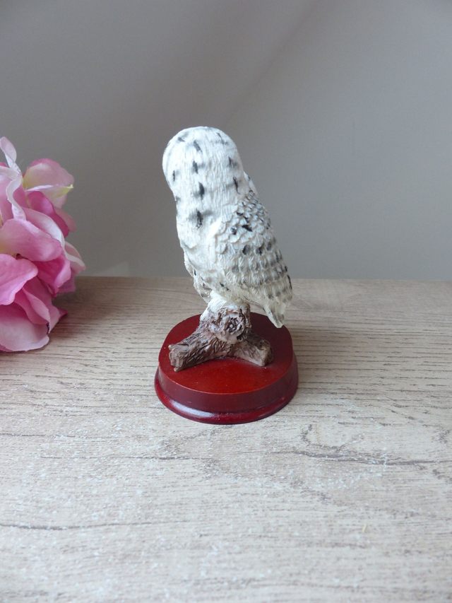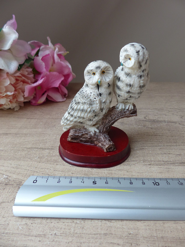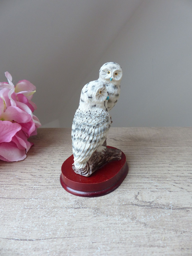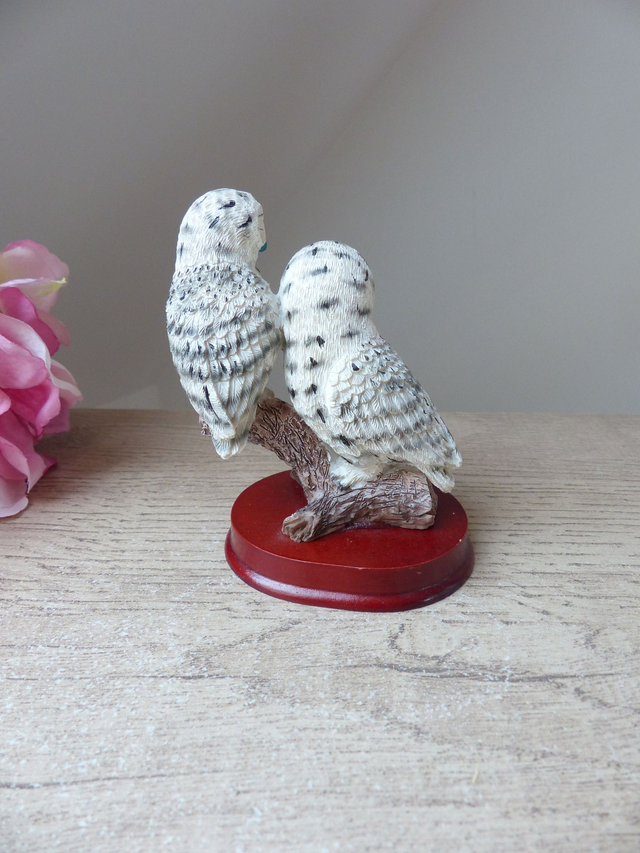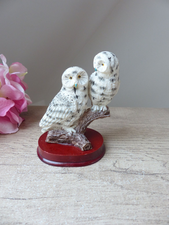 Figurine Vintage Couple de Chouettes Blanches des Neiges – Statuette Réaliste en Résine sur Socle, Déco Symbolique Amis ou Amoureux, Cadeau