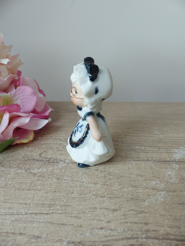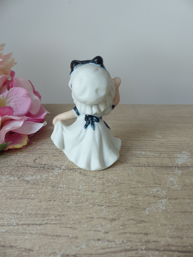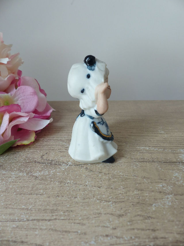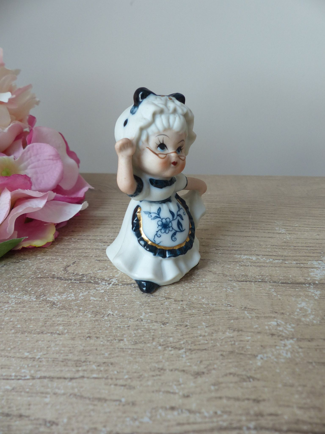 Figurine vintage en biscuit représentant une grand-mère dansante – robe blanche, tablier bleu, bonnet et lunettes – miniature peinte main