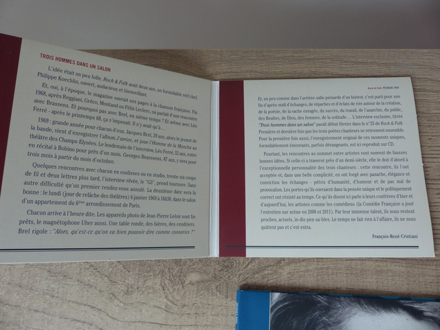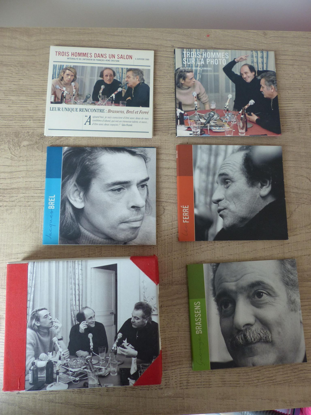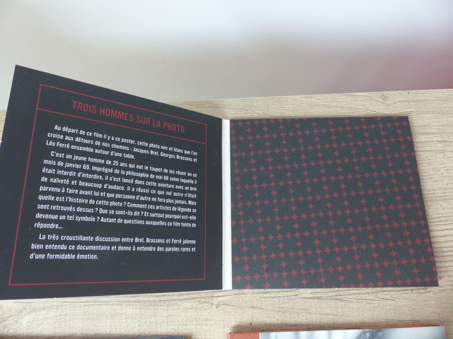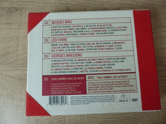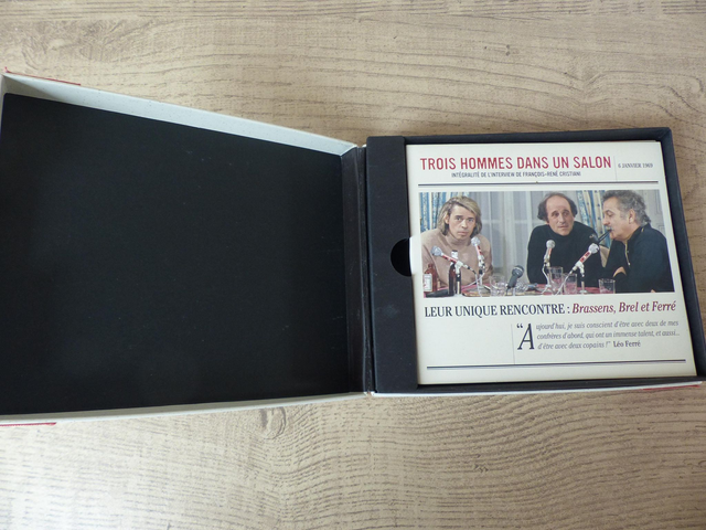 Coffret luxe avec 5 digisleeve : 1CD best of Brassens, 1CD best of Brel, 1CD best of Ferré, 1CD avec l'interview, 1 DVD avec le film "Trois hommes sur la photo"