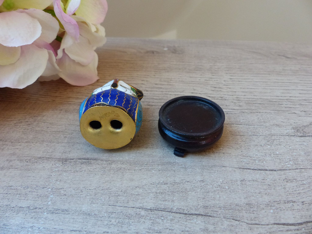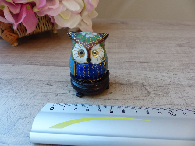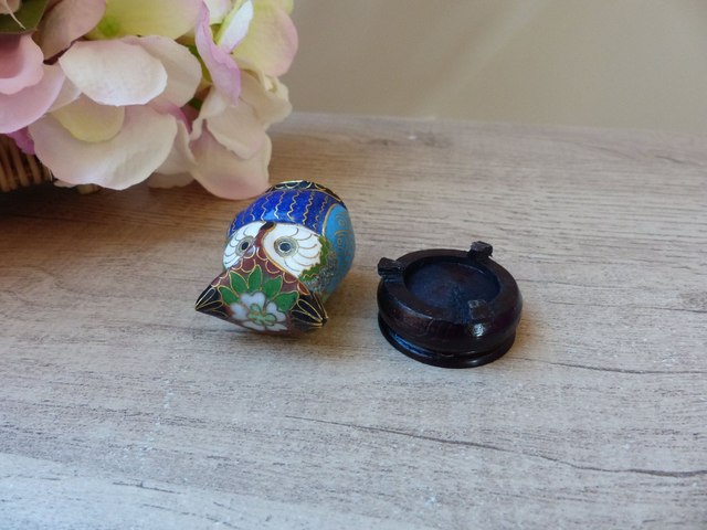 Mignon Petit Hibou Bleu en Laiton Cloisonné sur Socle en Bois, hibou miniature cloisonné, hibou décoratif, hibou style asiatique, collection