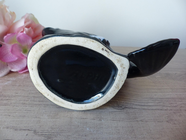 Apportez une touche marine et originale à votre intérieur avec ce pichet zoomorphe en forme de poisson, souvenir typique de villégiature. Réalisé en grès flammé noir et blanc, ce pichet ancien séduit par son design expressif et sa finition artisanale. Il est doté d’un bouchon, ce qui le rend aussi fonctionnel que décoratif.