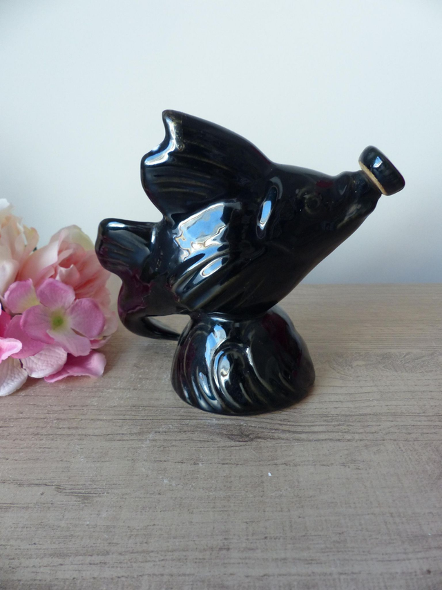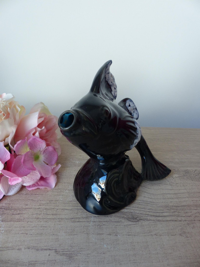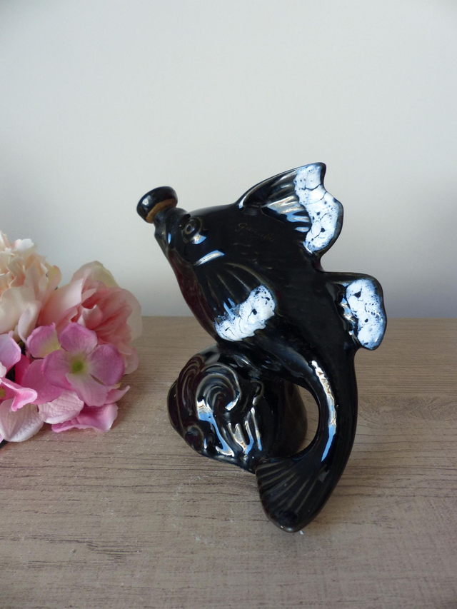 Pichet vintage en céramique forme de poisson – Grès flammé noir et blanc, cruche décorative pour eau, whisky ou liqueur, style bord de mer