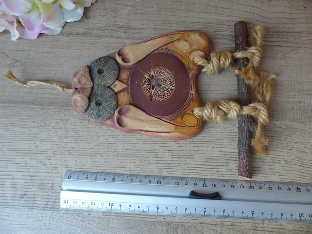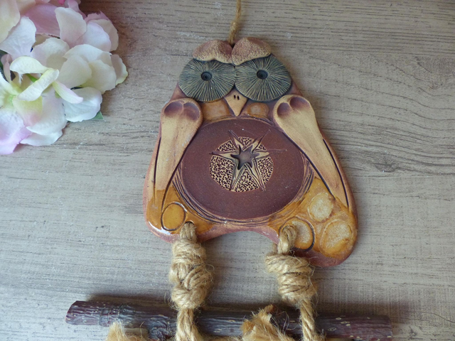 Apportez une touche de poésie naturelle à votre intérieur avec cette charmante plaque murale en forme de chouette, entièrement réalisée à la main. Cette pièce unique en poterie aux tons naturels séduit par ses grands yeux verts striés, son étoile sur le ventre et ses pattes en chanvre posées sur une branche en bois.