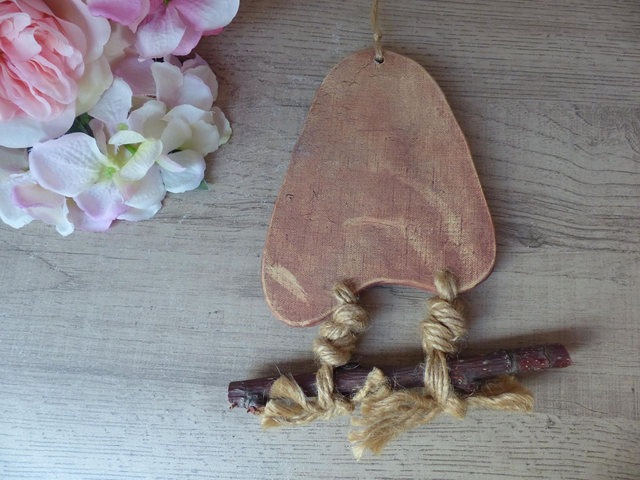 Détails originaux : yeux verts, étoile sur le ventre, pattes en chanvre, branche en bois