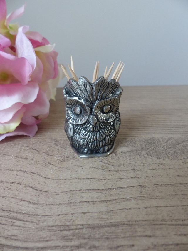 Porte cure-dents artisanal en étain en forme de hibou – Décoration de table chic et amusant, idée cadeau originale collectionneurs oiseaux