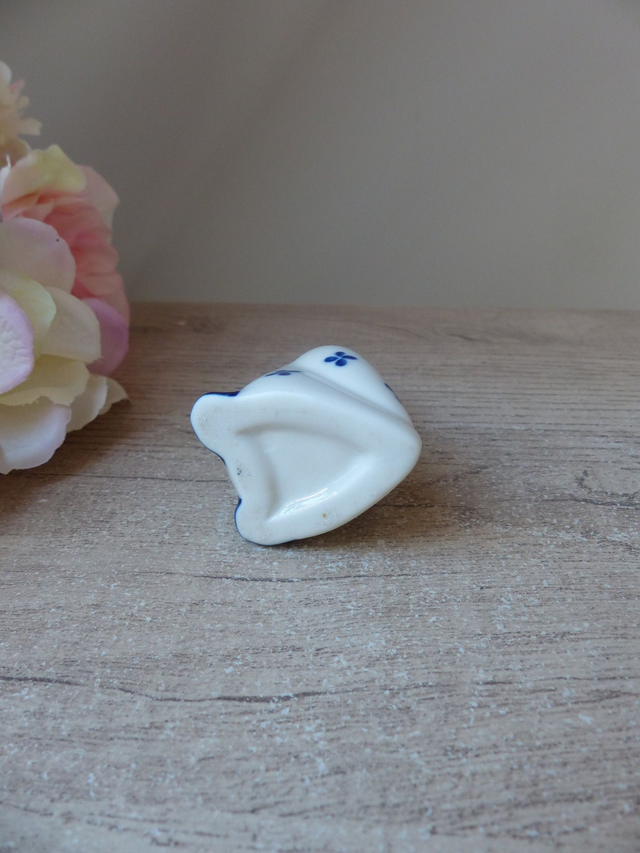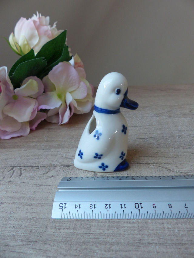 Le canard est en céramique blanche et bleue.