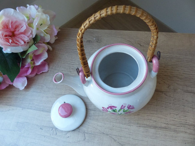 Théière Coréenne en Céramique Blanche avec Motif Fleurs Roses Anse en Bois Amovible – Théière pour Infusion, Décoration Cuisine Style Bohème