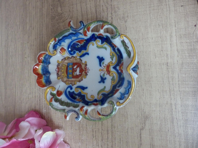 Apportez une touche d’élégance normande à votre intérieur avec cette ancienne coupelle en céramique "Vieux Rouen", ornée du blason de la ville et de délicats motifs floraux.