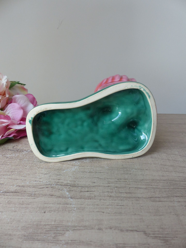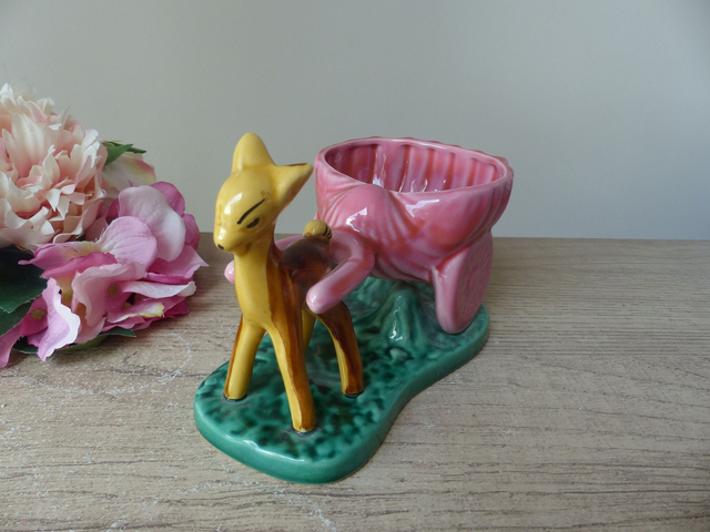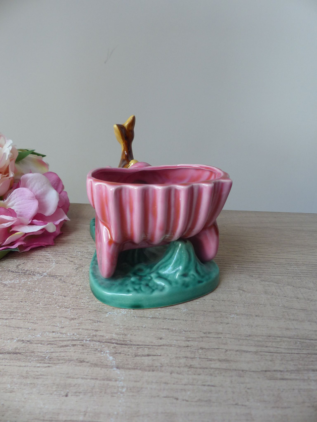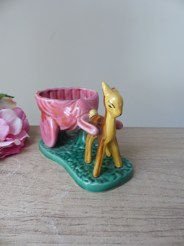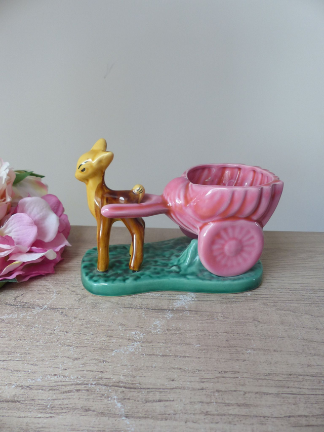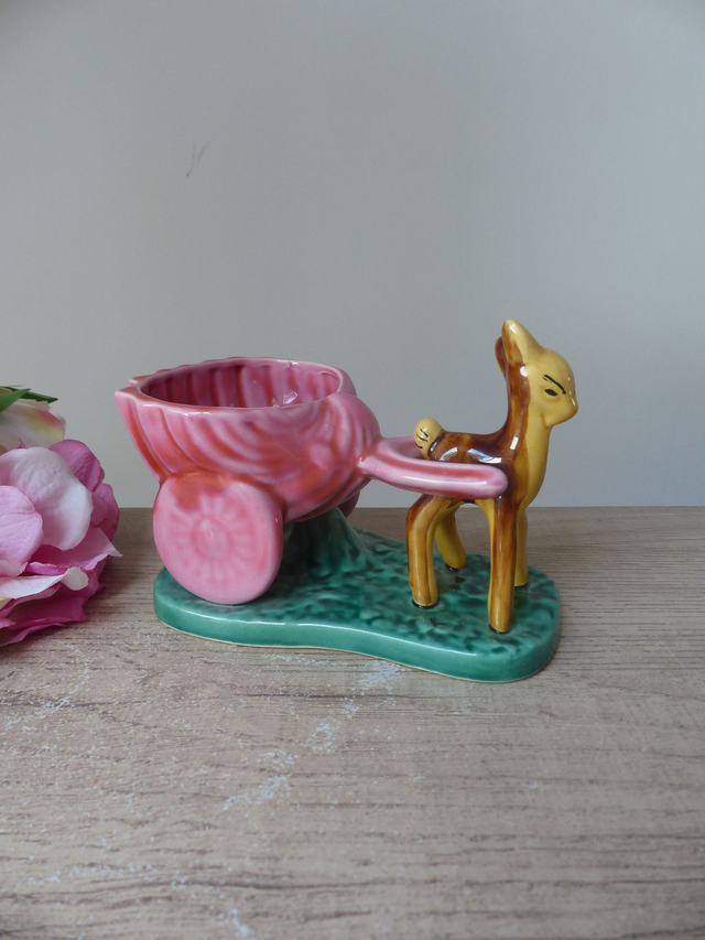 Ajoutez une touche de nostalgie et de douceur à votre intérieur avec ce charmant cache-pot en forme de biche façon Bambi, tirant une petite charrette. Réalisé en céramique émaillée dans les années 1970, cet objet au style kitsch et attendrissant mêle les teintes de rose, vert et marron pour un rendu délicieusement rétro.