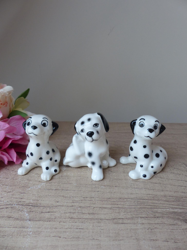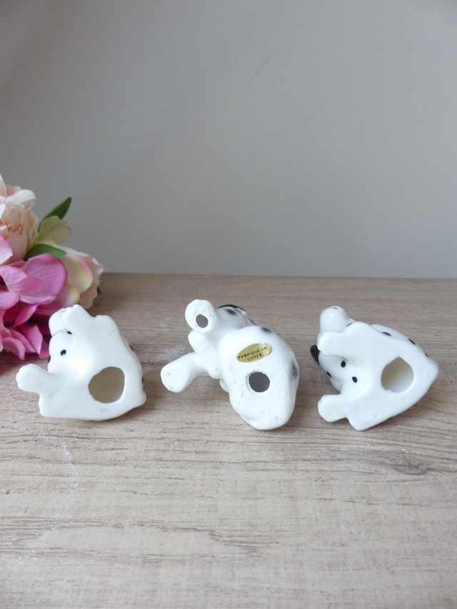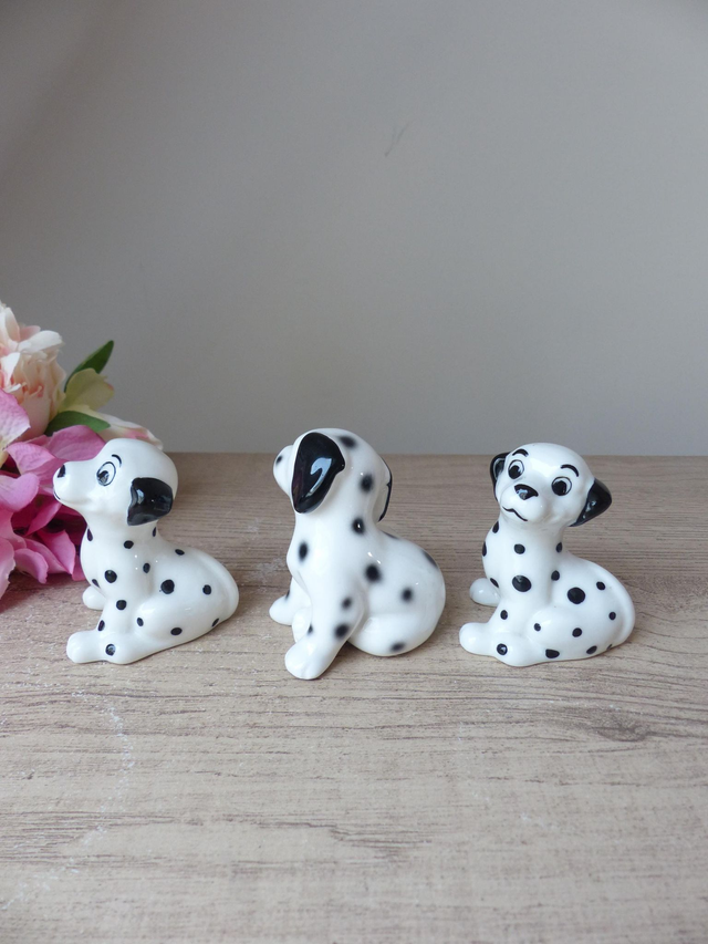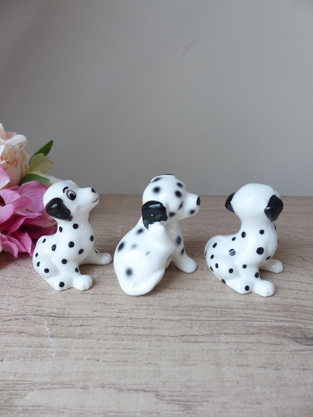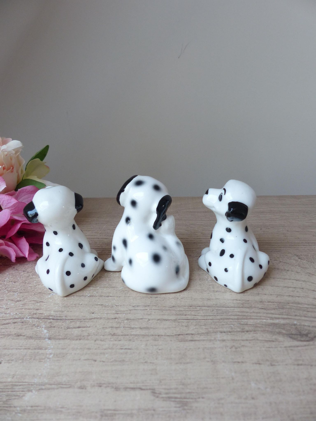 Il s'agit d'un ensemble de trois adorables figurines de chiens assis dalmatiens blancs à pois noirs en céramique.