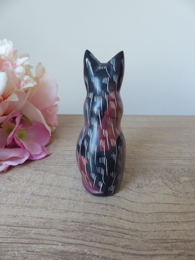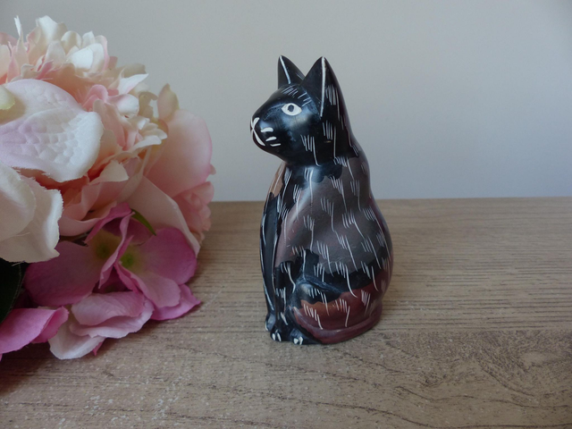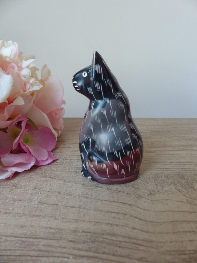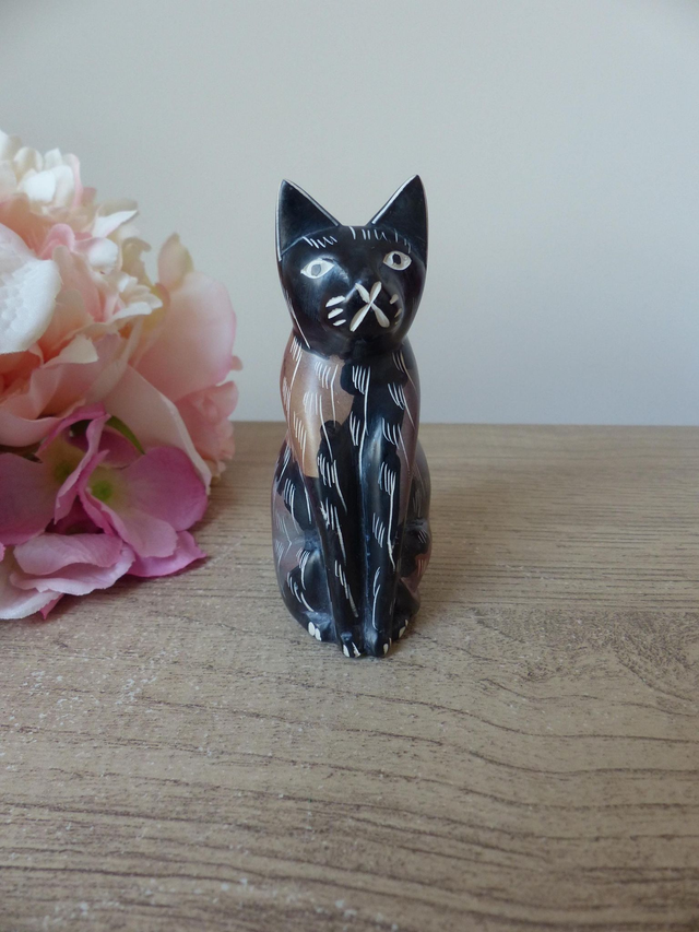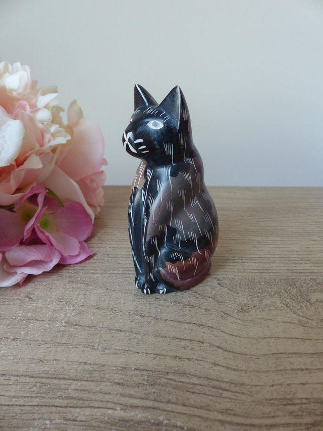 Chaque pièce est unique et raconte une histoire. Ce chat en stéatite est bien plus qu’une figurine : c’est une présence féline pleine de charme et de mystère.