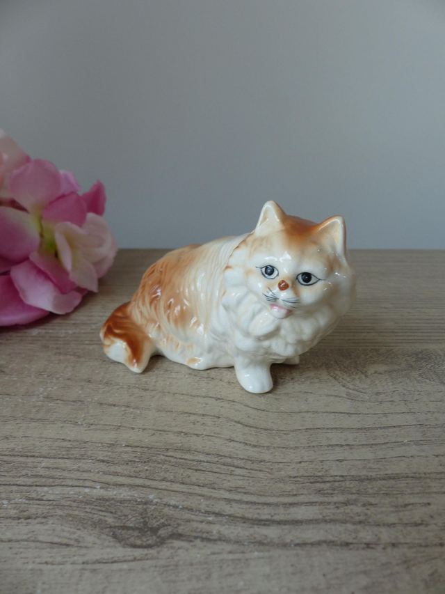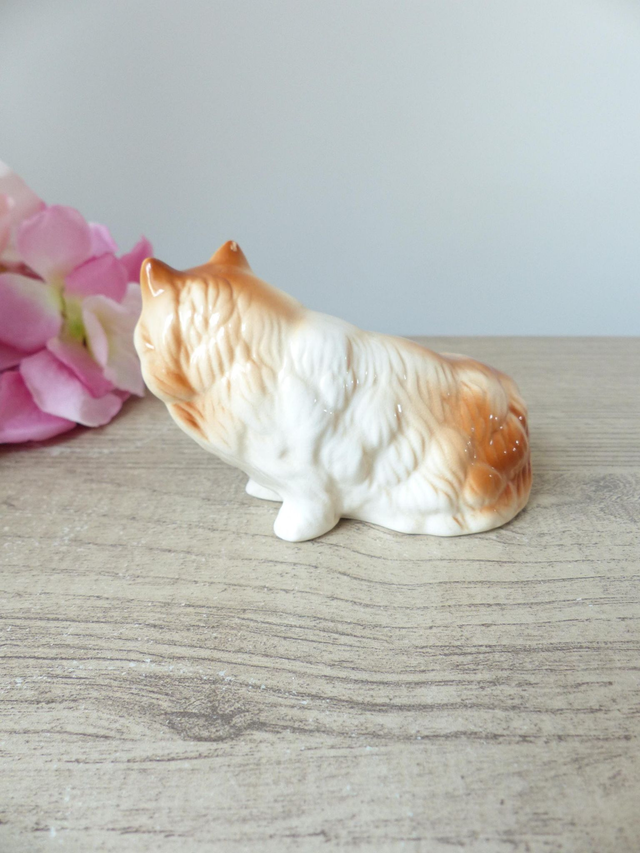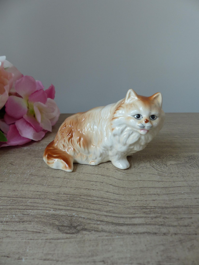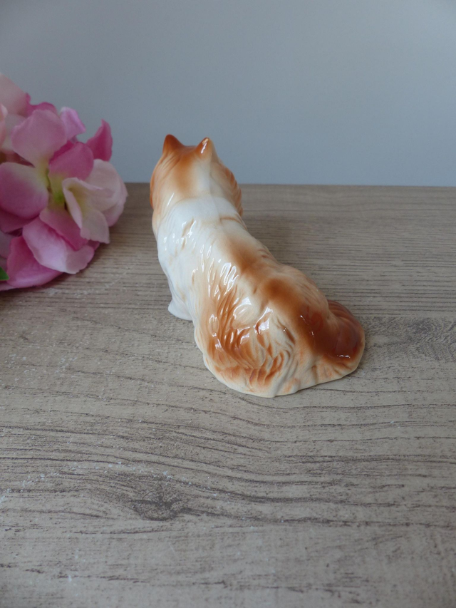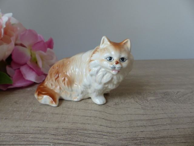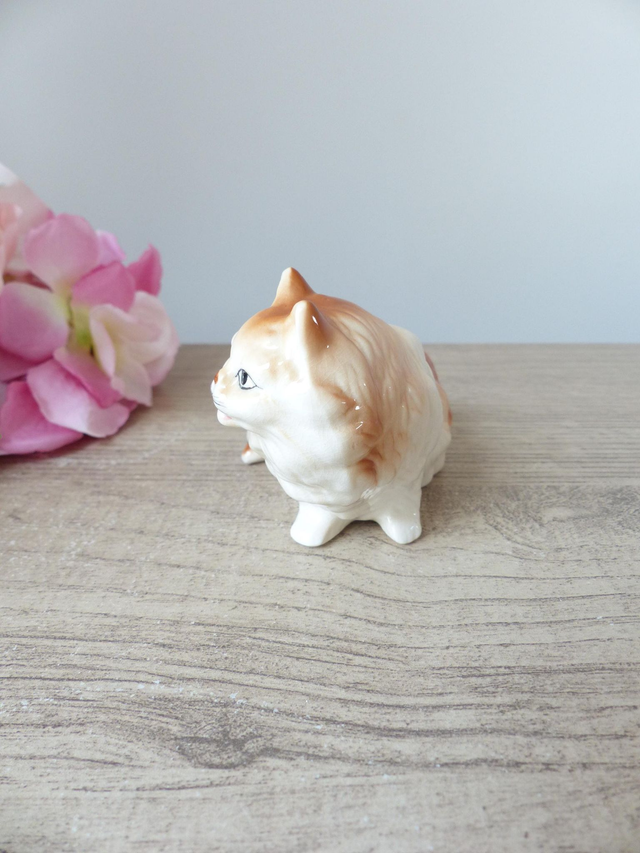 Le chat est réalisé en céramique orange et blanche, avec les yeux noirs.