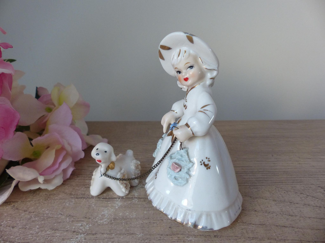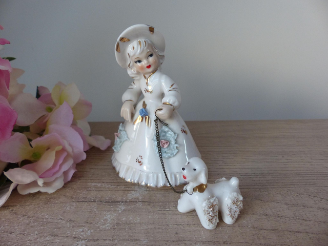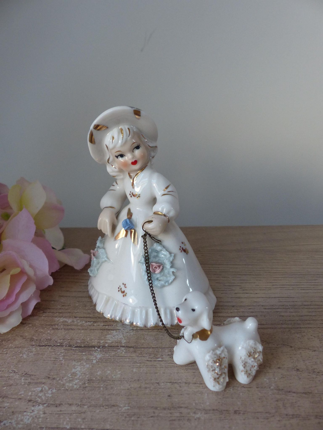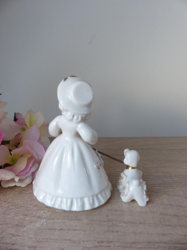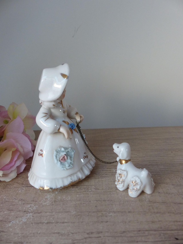Il s'agit d'une ravissante figurine en porcelaine d'une dame belle époque et son chien.