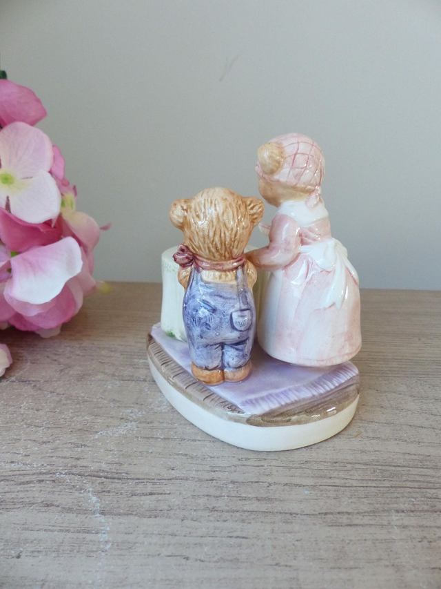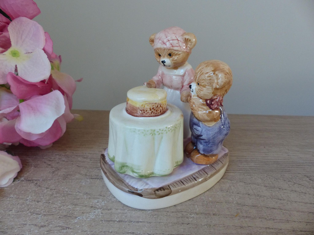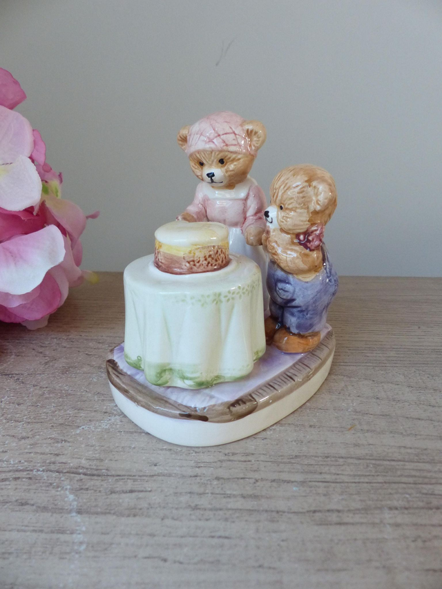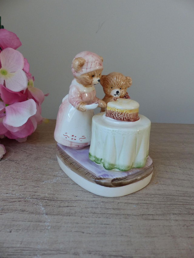 Craquez pour cette adorable figurine en céramique représentant une scène pleine de tendresse entre une maman ours pâtissière et son ourson gourmand. Issue de l’ancienne collection Léonardo, cette pièce vintage est un véritable concentré de douceur et de charme.
