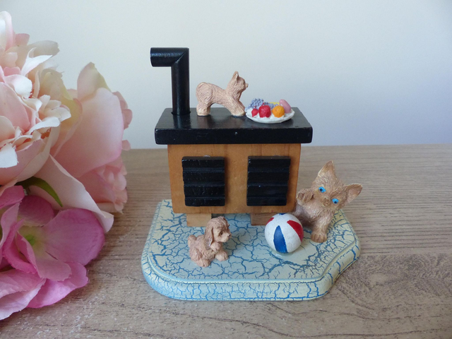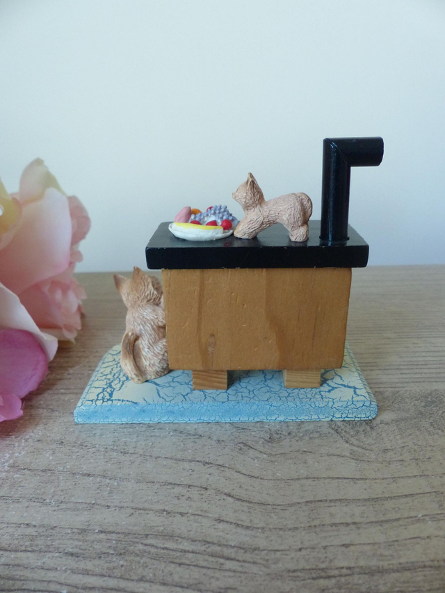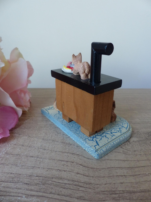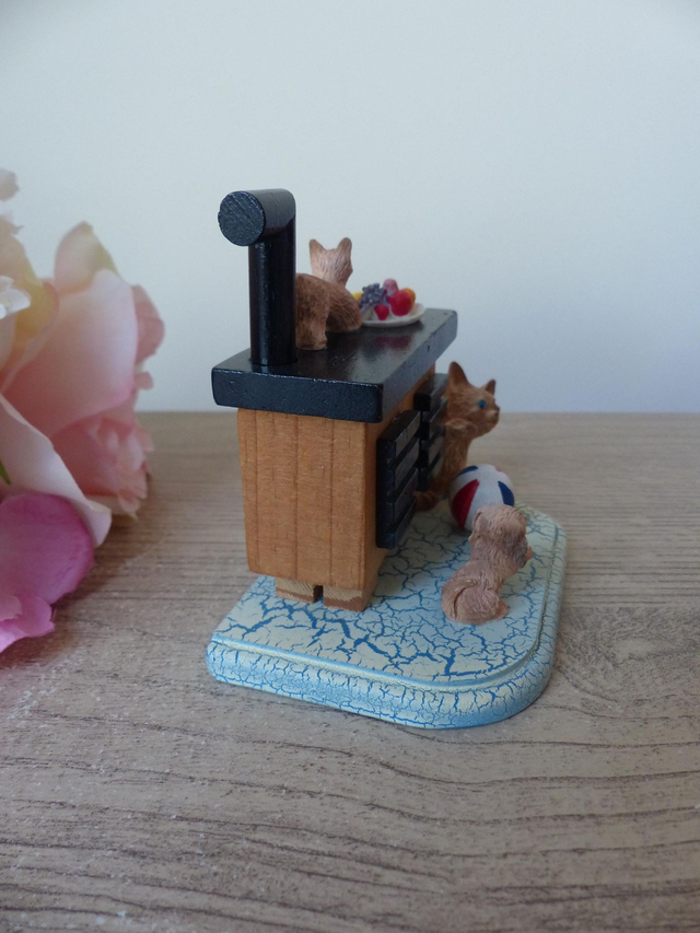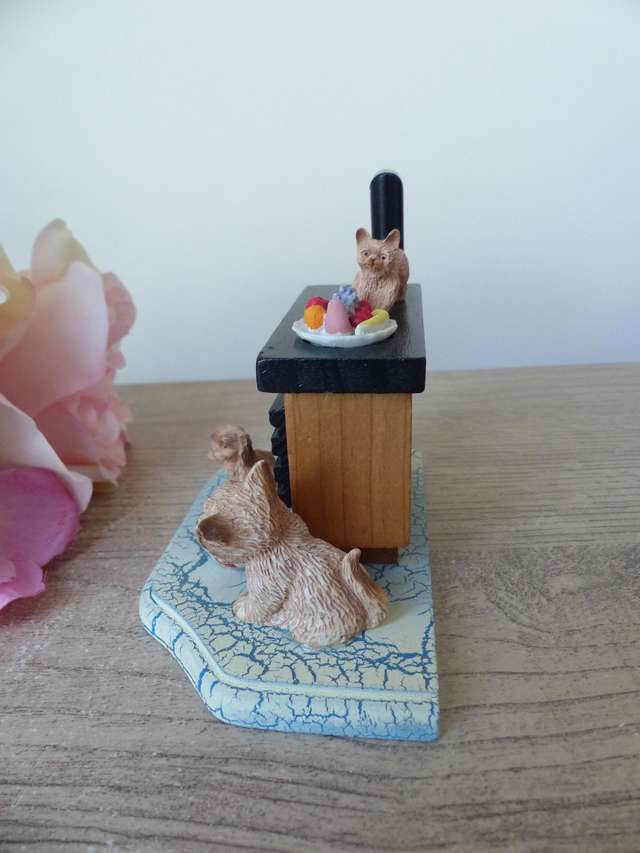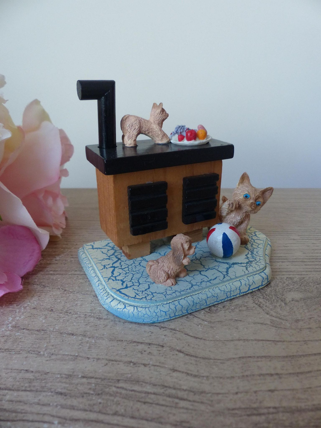 C'est un objet vintage représentant deux chats et un chien espiègles qui jouent autour d'une cuisinière.