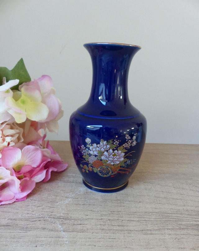 Il est décoré d'une charrette chargée de fleurs en pleine floraison. La finition est dorée avec un liseré bleu plus clair autour du vase.