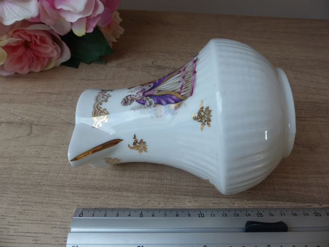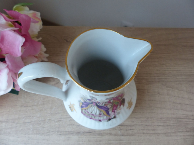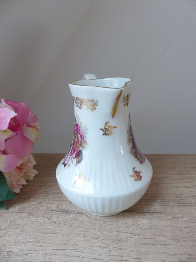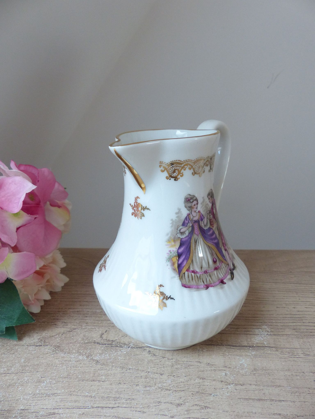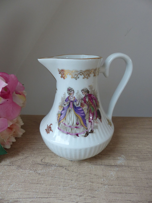 Ajoutez une touche d’élégance française à votre intérieur avec ce petit pichet en porcelaine de Chauvigny, décoré d’une scène galante romantique. Ce modèle ancien séduit par son style raffiné, sa finition dorée et son charme d’époque. Il peut être utilisé comme pot à lait, petite carafe, ou simplement comme objet décoratif dans une chambre, un salon ou un boudoir.