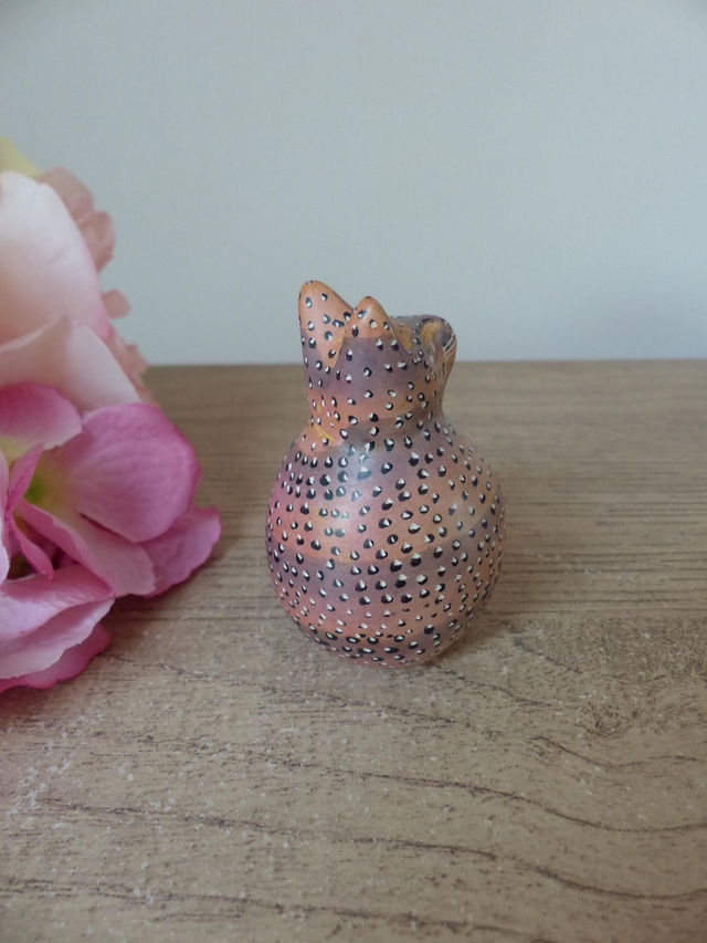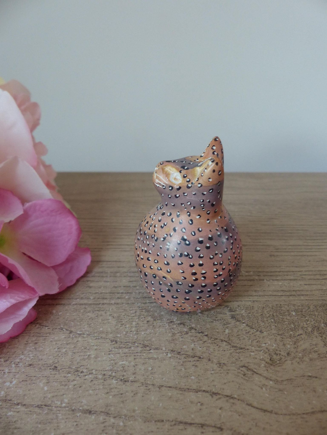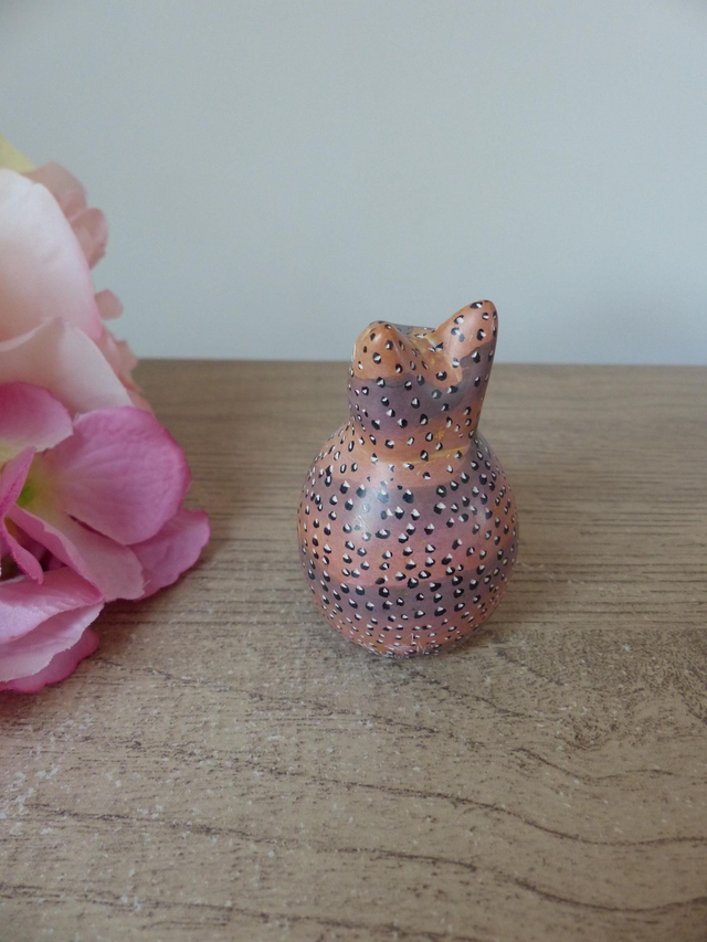 La figurine a été sculptée et peinte à la main avec des petits points blancs et marron.