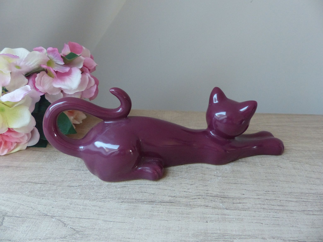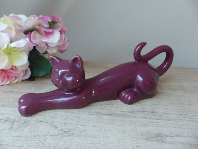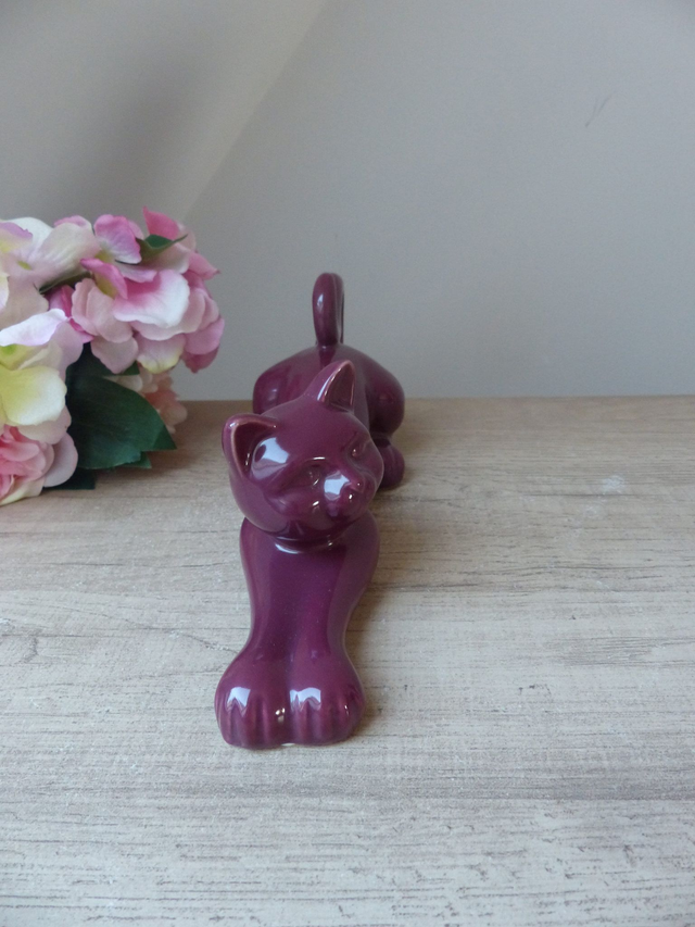 Apportez une touche féline à votre intérieur avec cette statue vintage représentant un chat en pleine séance d’étirement. Élancé, joueur et raffiné, ce chat en céramique rouge bordeaux séduit par sa finition brillante et sa silhouette allongée.