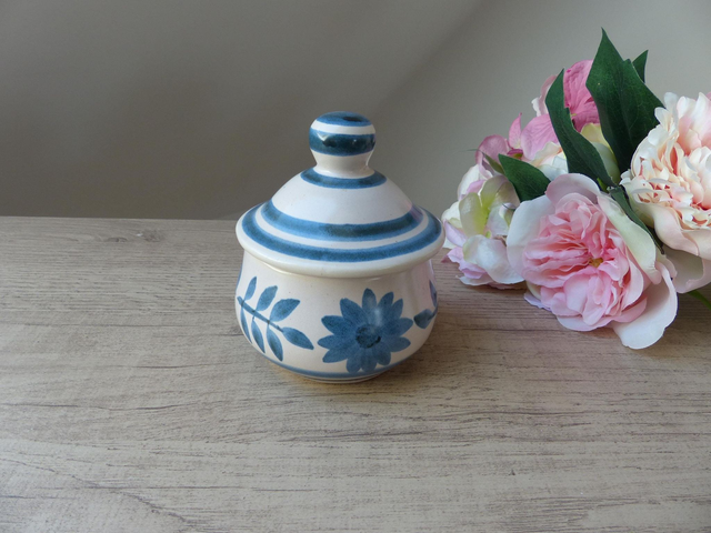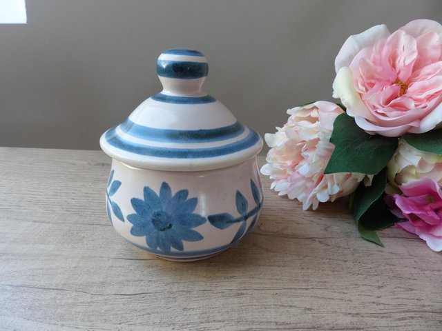 Il s'agit d'une boîte à sucres en grès avec couvercle.
